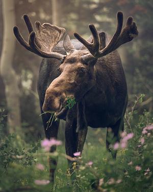 A bull moose munches on some clover in the middle of a patch of wildflowers.