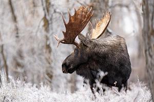 A bull moose looks back over the snow covered scene, as if in remembrance of fall.