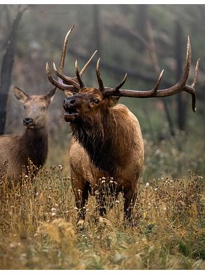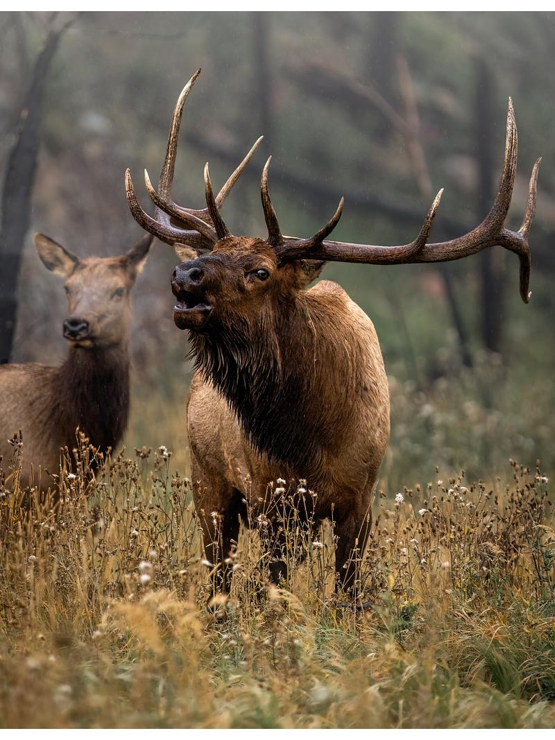 A bull elk guiding his harem through the rain storm with a strong bugle.