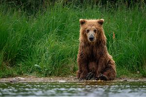 A young brown bear cub waits for it's mom to come back from fishing