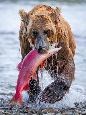 An Alaskan brown bear with a large colorful sockeye salmon meal.
