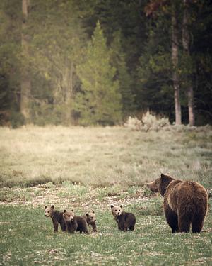Grizzly 399 and her four little cubs pause to look around in a slight rain storm
