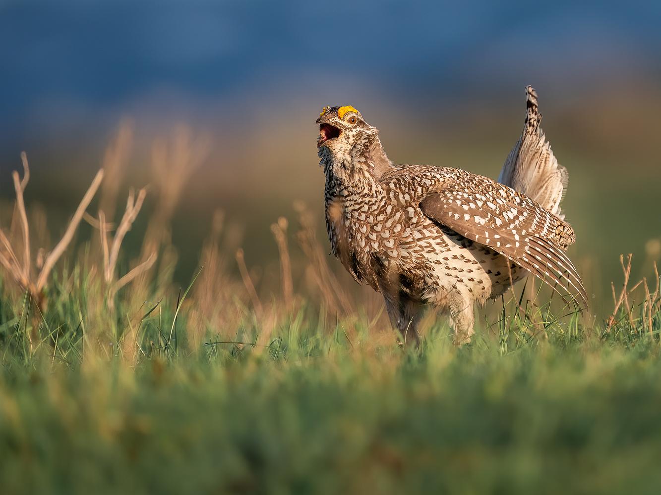 A male sharptailed grouse stops mid-strut to call out to any females nearby. letting them know that he's the best mate around.