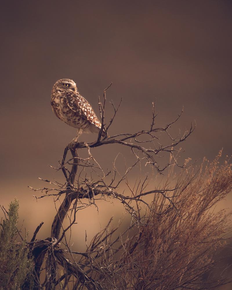 A male burrowing owl watches the sunset as he watches over his burrow.