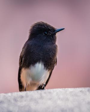 A black phoebe poses as a person in a pink shirt walks behind it.