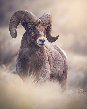 A bighorn ram makes his way through the dry grasses