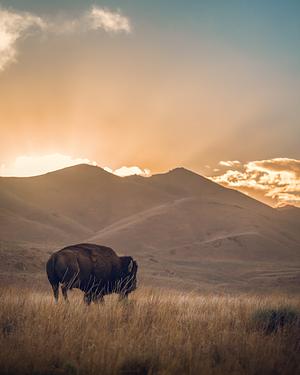 A bull bison wanders into the sunset in pursuit of the rest of the herd. That, or in pursuit of the western stereotype.