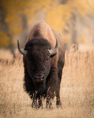 A big bull bison stops and stares ahead in front of the fall color