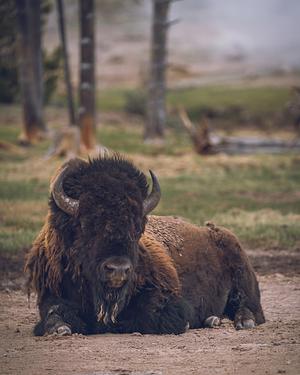 A large bison resting in one of the thermal areas around Yellowstone National Park
