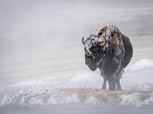A bull bison standing on a small island in the steamy Yellowstone river in the middle of winter.