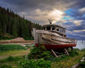 An old dry docked boat slowly rotting in the Alaskan landscape