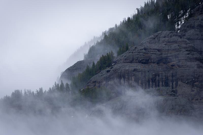 Thick clouds form around the mountain and trees ahead of the storm