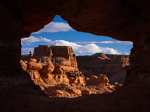 Looking through a rock window into the Valley of the Goblins in southern Utah